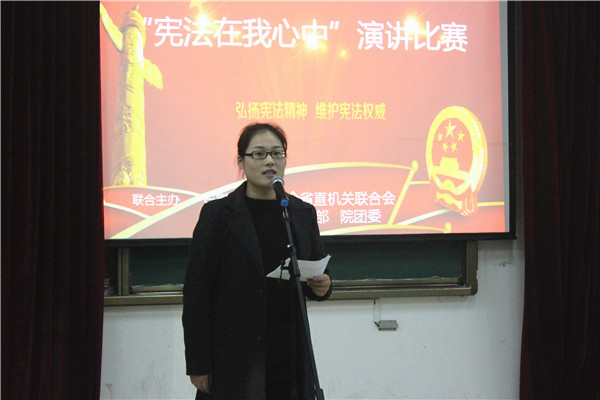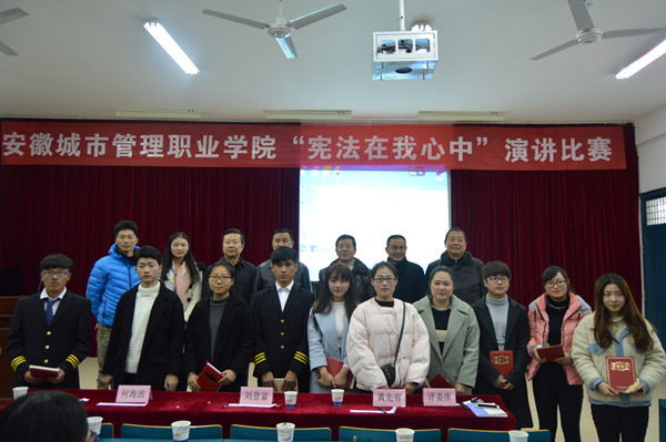 为弘扬法治精神,增强青年学生知法、懂法、守法、用法意识,11月30日下午,在第三个“国家宪法日”来临之际,我院思政教学部、院团委,联合安徽省演讲学会省直机关联合会,共同举办了“宪法在我心中”演讲比赛。