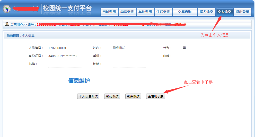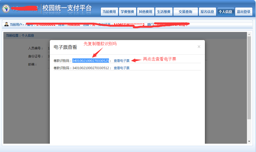 1、学生在校园统一支付平台缴费成功、待银行结算之后(正常情况第三天下午以后,节假日顺延),学生通过电脑登录校园统一支付平台,先点击个人信息交易查询,然后点击查看电子票,如图1;