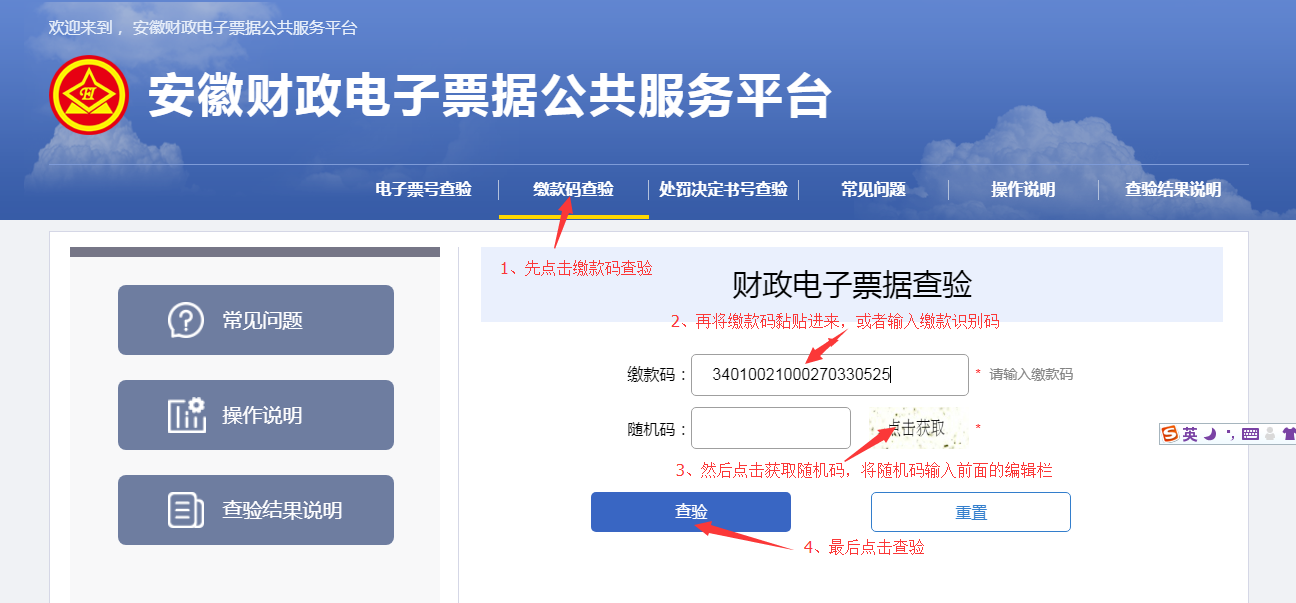 3、进入安徽财政电子票据公共服务平台后,先点击缴款码查验,再将缴款码黏贴进来或者直接输入缴款识别码,然后点击获取随机码输入前面的编辑栏(不区分大小写),最后点击查询;如图3