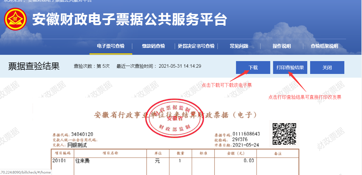 4、在电子发票页面可以点击打印查验结果进行打印该发票,也可以通过点击下载将发票下载下载另行打印,如图4。
