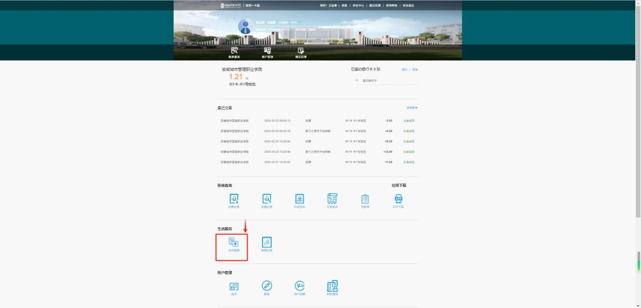 在学校一卡通自助机上进行电控充值选择生活缴费如图