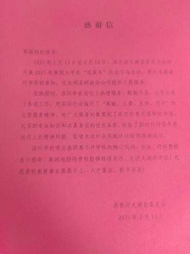 近日,我院收到共青团太湖县委员会发来的表扬信,信中对2023级现代物流管理专业学生朱路梁在2025年大学生“返家乡”社会实践中的突出表现予以高度肯定和表扬。“返家乡”社会实践活动是共青团组织引导广大青年学子深入基层、服务乡村、锻炼成才的重要品牌项目。自校团委全面启动该活动以来,各二级学院积极响应,通过线上线下多种方式广泛宣传,鼓励学生利用假期返回家乡、投身实践、服务群众、提升自我。