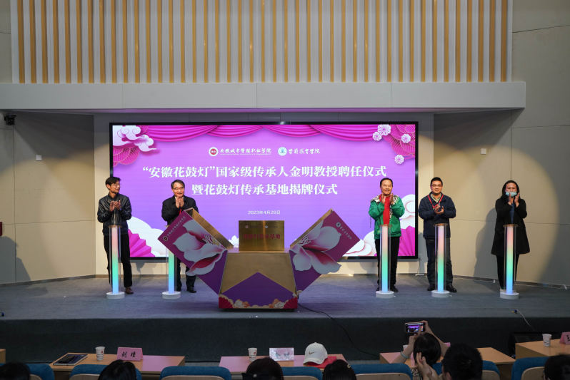 4月26日,学院在新站校区艺馨楼报告厅举行安徽花鼓灯国家级传承人金明教授聘任仪式暨花鼓灯传承基地揭牌仪式。党委副书记、院长刘瑾为金明教授颁发聘书,并与教务处、学前教育学院负责人共同为安徽花鼓灯传承基地揭牌。