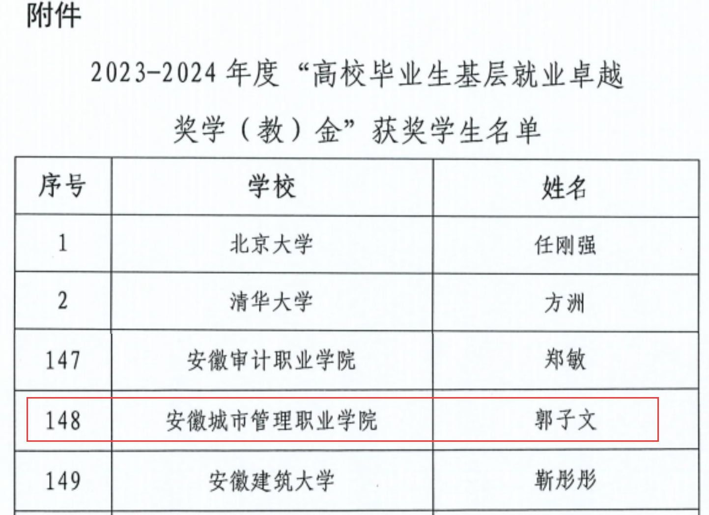 “高校毕业生基层就业卓越奖学(教)金”是由教育部高校学生司(高校毕业生就业服务司)与教育部学生服务与素质发展中心共同指导、中国教育发展基金会设立的。旨在深入贯彻落实党中央、国务院关于引导和鼓励高校毕业生到基层就业的决策部署,奖励赴基层就业并作出突出业绩的普通高校毕业生和普通高校指导服务大学生赴基层就业工作有突出贡献的教师。2024年,全国共有398名优秀高校毕业生获此殊荣,安徽省仅17位同学获此殊荣。