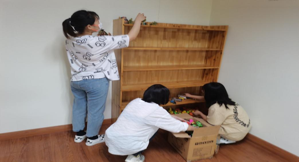 志愿者们将房间布置的简洁、温馨、舒适、安全。女生们主要负责擦桌子摆放沙盘玩具等,搬放桌椅柜架等由男生负责。在科学的分工下,志愿者们很快就把中心的每个功能室打扫完毕并进行了布置。